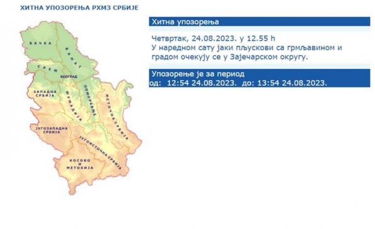 - У наредном сату јаки пљускови са грмљавином и градом очекују се у Зајечарском округу - наводи се у упозорењу РХМЗ-а.