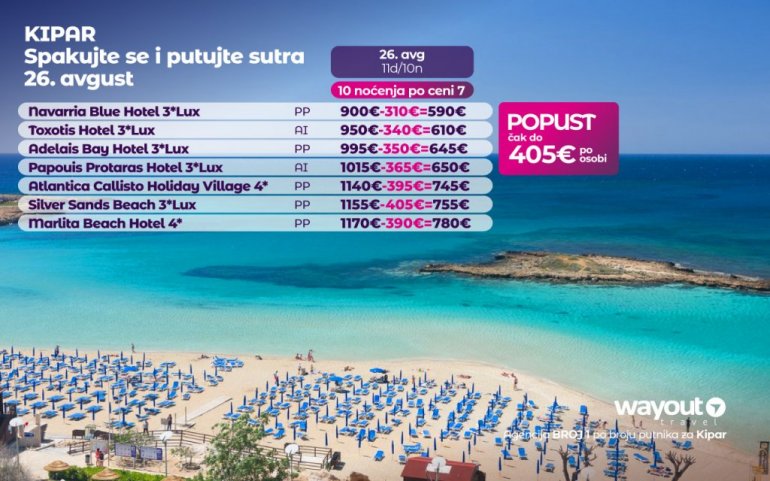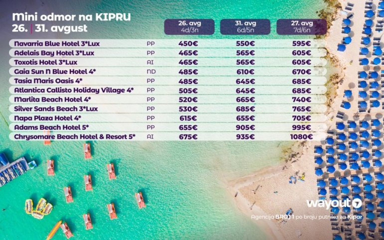 Дефинитивно нова омиљена летња дестинација наших туриста, свакако јесте рајско острво Кипар. Осетите чари Медитерана, фантастичних плажа, веома квалитетних хотела, изузетне гастрономске понуде, као и незаборавног ноћног провода. За наше путнике смо спремили одличну фирст минуте понуду са пажљиво изабраним хотелима, како на основу пређашњих искустава наших клијената, тако и на основу одличних оцена на туристичким порталима.