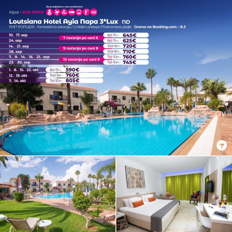 Овај објекат је удаљен 6 мин хода од плаже. Ови апартмани у породичном власништву налазе се на мирној локацији, недалеко од динамичне Аја Напе. Представљају пријатну и опуштајућу базу, са обиљем рекреативних садржаја. Пространи, у потпуности климатизовани апартмани Loutsiana Deluxe садрже велики балкон или терасу и бесплатан WiFi. Поједине смештајне јединице садрже потпуно опремљену чајну кухињу са електричним кувалом, фрижидером и тостером. Такође укључују простор за седење са ЛЦД ТВ-ом. Сеф је доступан уз доплату. Велики базен има хидромасажни део и окружен је предивним вртом. Потрошите енергију у новој теретани или уживајте у партији билијара у играоници. Када вам се отвори апетит, можете да уживате у разноврсним интернационалним и локалним специјалитетима и лаганим оброцима у ресторану поред базена који ради готово током целог дана.