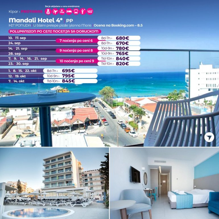 Овај објекат је удаљен 4 мин хода од песковите плаже у Протарасу. Такође, хотел поседује и спољашњи и унутрашњи базен са лежаљкама. Свака соба у Мандали хотелу садржи: кетлер, мини фрижидер, тв и приватни балкон. У купатилима се налази фен. У хотелу је доступан ресторан са локалним специјалитетима. Поред базена се налази бар. На улазу у хотел се налази супермаркет где можете пронаћи све намирнице за припремање хране. Популарна плажа Fig Tree се налази на 1км од хотела, град Agia Napa је удаљен 12км док је аеродром у Ларнаки удаљен 45км. Хотел пружа бесплатно паркинг место.