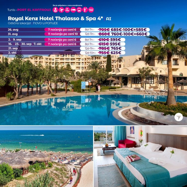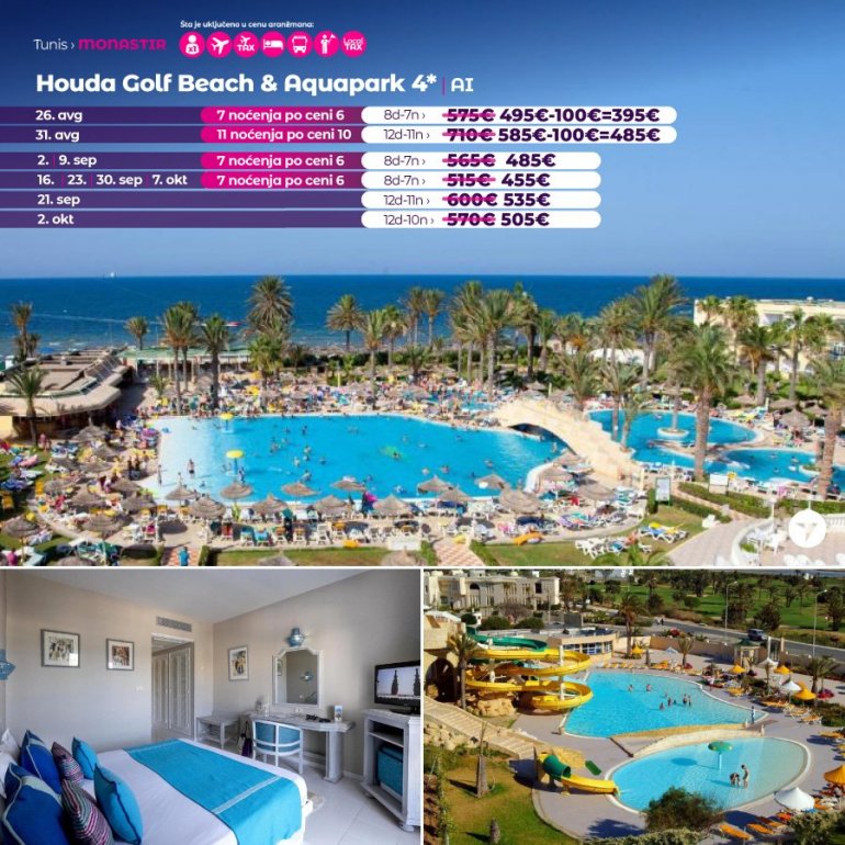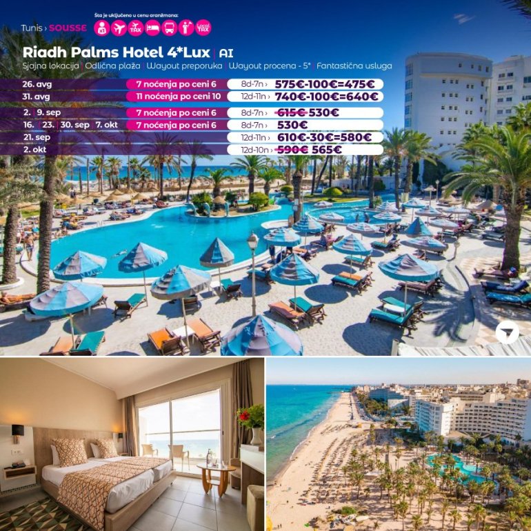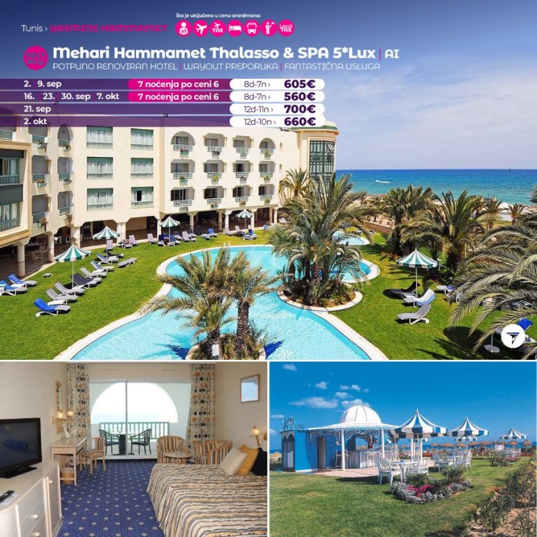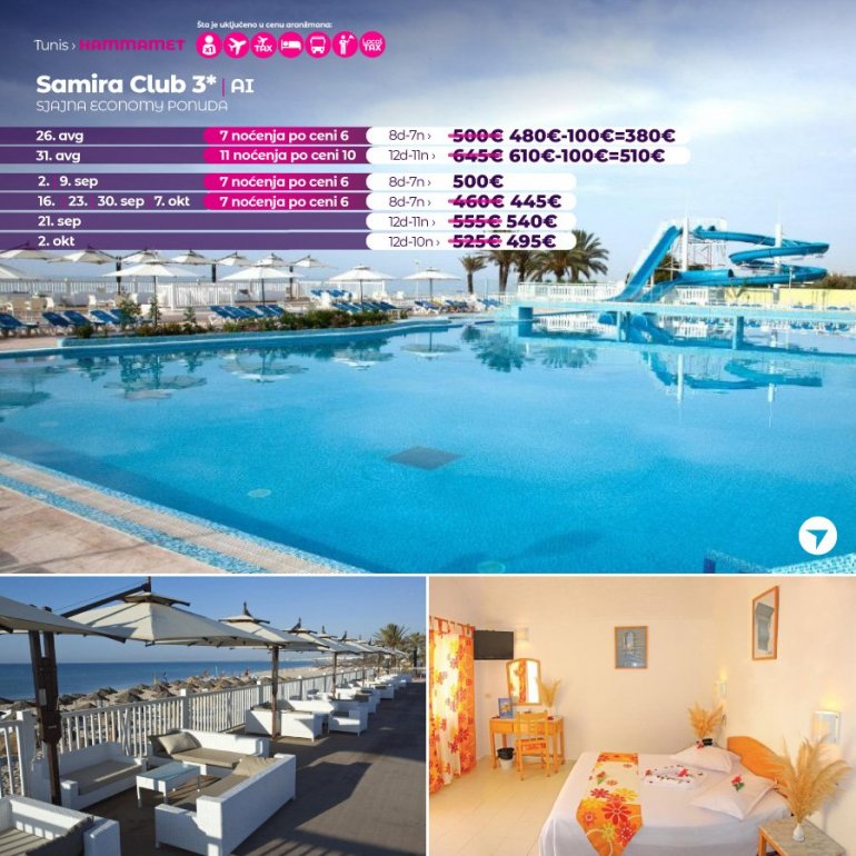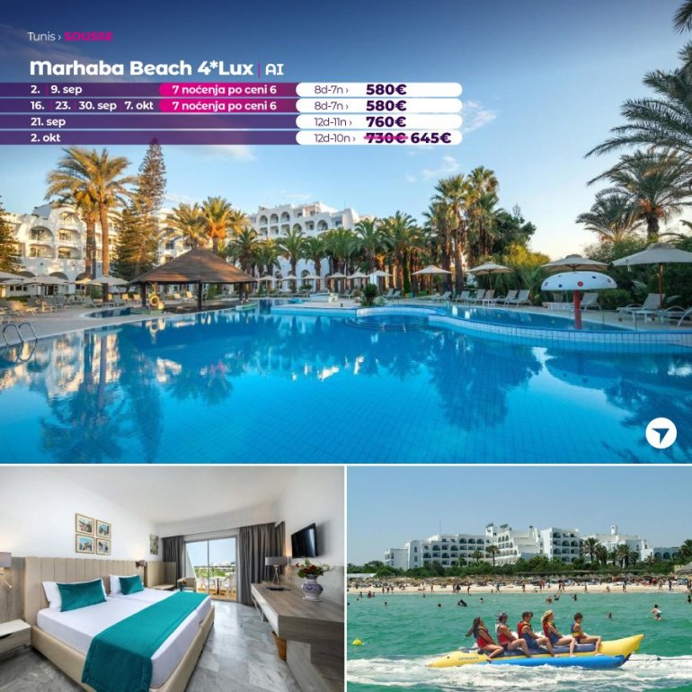 Искључиво са AirSerbia у Тунис! 7 ноћења по цени 6 ноћења / 10 ноћења по цени 9 ноћења / 11 ноћења по цени 10 ноћења. Издвајамо из понуде најтраженије хотеле за лето 2023: