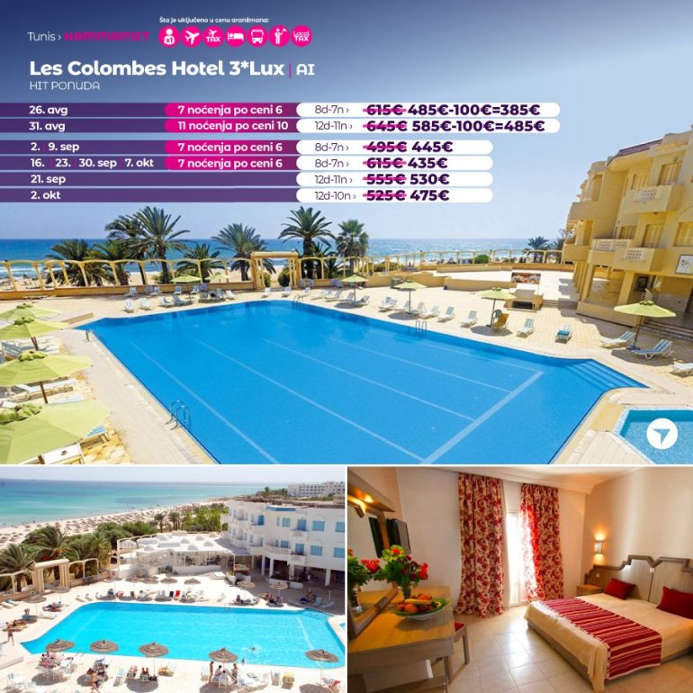 Les Colombes је хотел са 3* који је смештен у Хаммамету, у туристичкој зони. Хотел се налази на 15мин од Неаполис музеја. За госте је доступна теретана. У објекту је доступна рецепција 24х. За најмлађе госте ту је клуб за децу. Поред плаже, гости могу да уживају и на спољном базену.Хотел излази на своју плажу.Свака соба у хотелу је климатизована, има своје купатило и мини бар. Код рецепције се налази lobby bar. Оброци из услуге All inclusive се служе у главном ресторану.