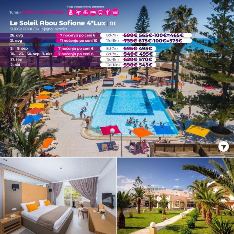 Удаљен је само 25км од аеродрома у Монастиру, 8км од центра Sousse и 30км од центра Монастира. Le Soleil Abou Sofiane Хотел поседује око 380 соба подељене у две зграде на три спрата. Свака соба у хотелу има свој балкон или терасу. Собе су климатизоване и стандардно опремљене (мини бар, ТВ...). Свака соба има сопствено купатило. У склопу хотела је башта и велики спољашњи базен. Ту је и неколико ресторана и барова: "Le Doyen", а ла царте ресторан "Le Jasmine" са традиционалном тунижанском кухињом, Snack Bar на базену, Бар на тераси и многи други. Гостима хотела је на располагању фитнес центар, Kids Club, тениски терен, терен за одбојку на песку, боћање и водени спортови. За госте хотела се свакодневно одржавају разне активности и тематске вечери.