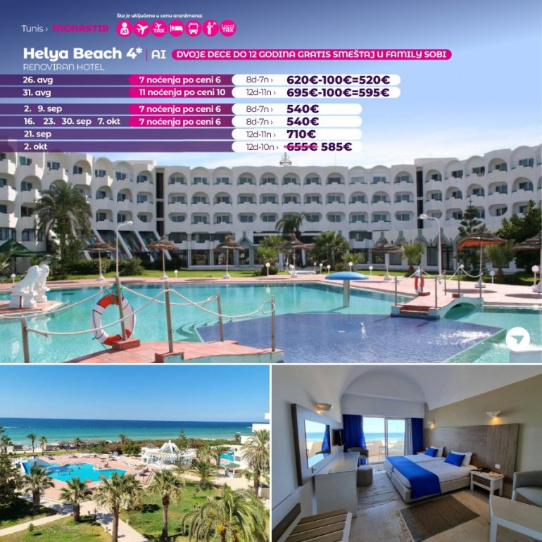 Овај хотел се налази испред плаже Скане-Монастир и располаже прелепим погледом на Средоземно море. Смештај са 4 звездице обухвата приватну терасу, а хотел такође поседује 4 базена и спа центар. Све собе хотеле Helya Beach Resort недавно су реновиране и обухватају сопствено купатило, клима-уређај и ТВ са сателитским каналима. Хотел Helya располаже многим баровима и ресторанима. Са избором шоу кувања у ресторану Рубис, пицерије Ле Сафир, хамбургера и кромпирића у ресторану Barbeque, сваки гост ће пронаћи нешто за себе. Спа центар Thalasso Biocure нуди модерне здравствене и wellness садржаје на преко 300 м². Центар обухвата хамам, сауну, шкотски туш, каду са подводном масажом, кабину Vichy, млазни туш, третмане лица и тела алгама, као и антистрес масаже. Хотел се може похвалити са 4 базена. Два су на отвореном и намењена одраслим особама, а ту су и отворени беби базен и грејани базен. Гостима је на располагању такође фитнес центар. Можете користити тениске терене, терене за одбојку, рукомет, кошарку и мини-голф, а ту је и дневни забавни програм.