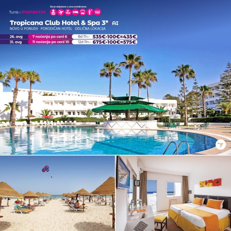 Hotel Tropicana club and SPA је породичан хотел идеално лоциран. Налази се на плажи, 3км од аеродрома у Монастиру и 10км од Суса. У склопу хотела су 2 главна базена са тобоганима који су отворени до 19х. Хотел излази на своју пешчану плажу. За узраст од 4 до 11 година ту је мини club.