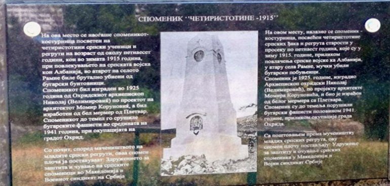 У настојању поспешивања иницијативе за обнову срушеног споменика у селу Рамне код Охрида, из Удружења за заштиту и очување српских споменика у Македонији, како подсећа Ристић, са делегацијом Војног синдиката Србије, јуна прошле године, на остацима монумента "Четири стотине - 1915", у склопу обележавања Видовдана и годишњице Брегалничке битке, постављена је спомен-плоча. Белег-подсетник на тужни део сурове српске историје, у покушају извлачења од заборава страдања и мученичке смрти српских регрута. Сада је та плоча - префарбана.