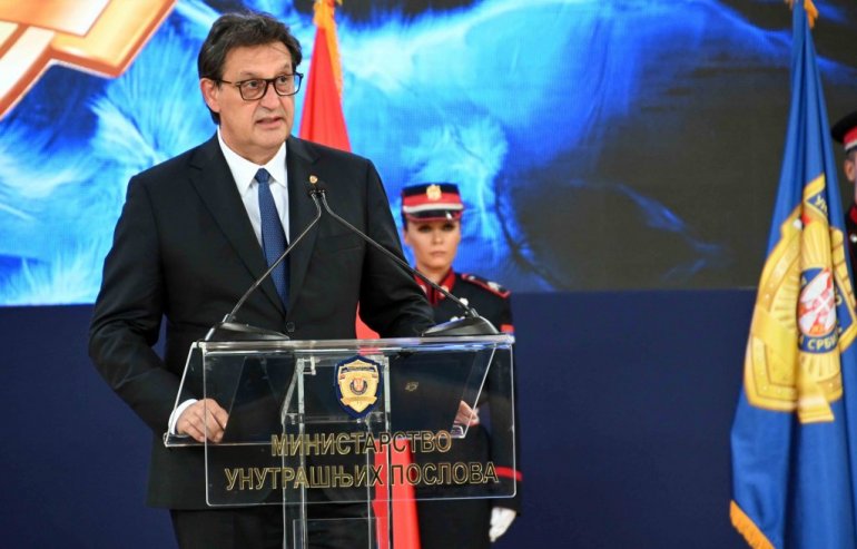 - Ви сте од данас и наша деца. Ви сте будућност Министарства унутрашњих послова и будућност Републике Србије. Од вас ће се тражити да се пуно трудите и пуно одричете, али, свакако, за само четири године, стајаћете овде, у строју, бацићете ваше капе увис и рећи: „Вредело је!“ - рекао је министар и захвалио родитељима нове генерације ђака Средње школе унутрашњих послова на поверењу, а председнику Србије и премијерки, као и министарствима просвете и финансија, на подршци. Министар је уручио плакете захвалности представницима државних институција који су допринели поновном отварању Средње школе унутрашњих послова.