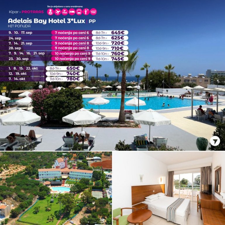 Хотел Adelais Bay удаљен је 500м од плаже Грин беј, плажа која се налази између чувене Фиг три плаже и Конос плаже. Хотелски простор покрива велика башта са отвореним базеном. Собе су климатизоване са САТ ТВ и балконом или терасом. Свака соба поседује сопствено купатило са феном за косу. У саставу хотела је Аурора ресторан и бар Илиос поред базена. Опремљен је игралиштем на отвореном столицама за љуљање и играоницом, док се уз доплату може обезбедити услуга чувања деце. Град Протарас удаљен је од хотела 15 минута хода.