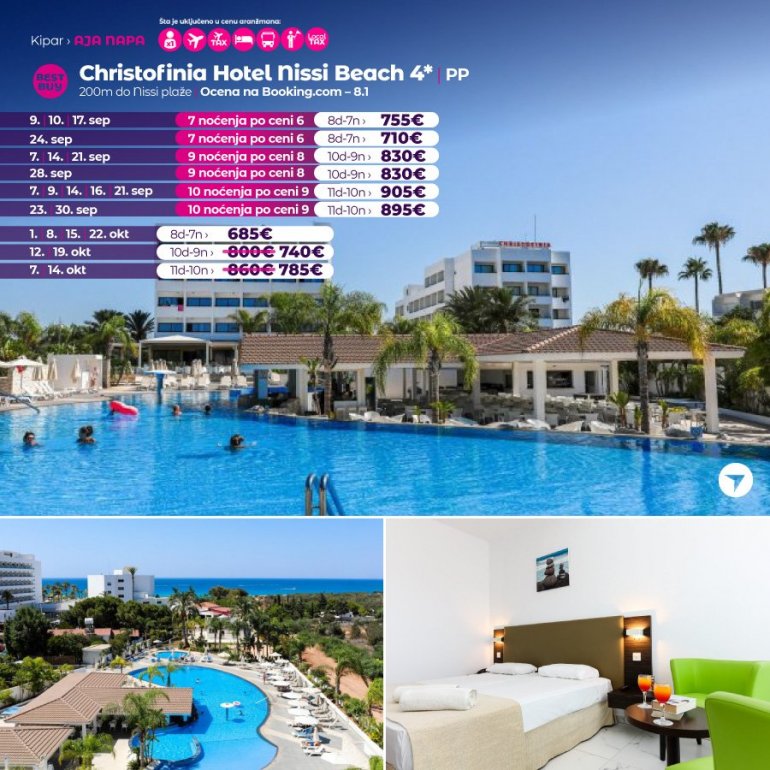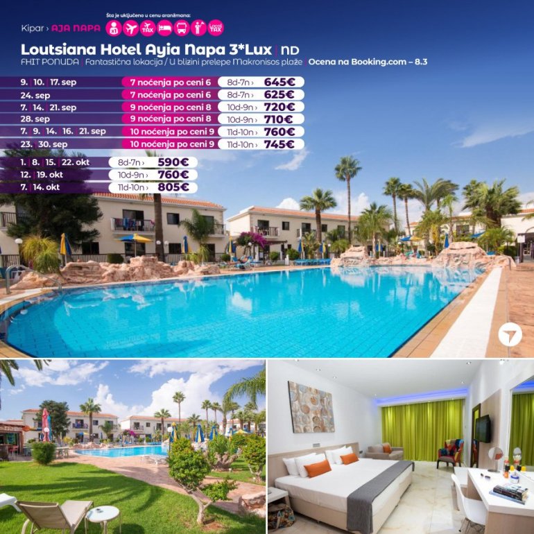 Луксузан хотел, налази се на плажи од белог песка, у заливу Ниси, познатом по лагуни са са плитком, тиркизно плавом водом. Центар Аја Напе, његови музеји, таверне и ноћни живот су удаљени око 3 км од хотела. Аутобуска станица је на 25 метара од хотела, аеродром Ларнака на 45 км. Хотел је изграђен 1991, а делимично реновиран 2016. године. Хотел има пет спољашњих базена, "лазy ривер", фонтане, џакузи и мали аква-парк. Ту су и Спа центар, унутрашњи базен, сауна, парно купатило, соларијум, теретана, масаже, козметички салон, стони тенис, билијар, осветљени тениски терен, дечији клуб, игралиште и базен, фризер, разне продавнице (јувелир, цвећарница, сувенирница...), анимација током сезоне (од маја до октобра).