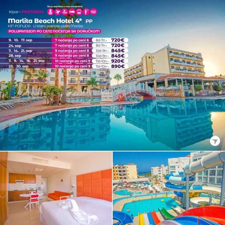 Хотел IIliada Beach jе смештен одмах поред пешчане плаже у центру Протараса и нуди базен са терасом која гледа на море. На располагању су вам такође дечји базен, два ресторана, три бара и снек бар. Све собе у хотелу IIliada Beach имају намештен балкон, ТВ са сателитским каналима, мини-фрижидер, апарат за припрему чаја/кафе и сеф. На плажи испред самог хотела можете уживати у великом избору садржаја за спортове на води, док се ресторани, продавнице и барови налазе на неколико минута хода. Најближи аеродром је Аеродром Ларнака, удаљен 42 км од хотела IIliada Beach.