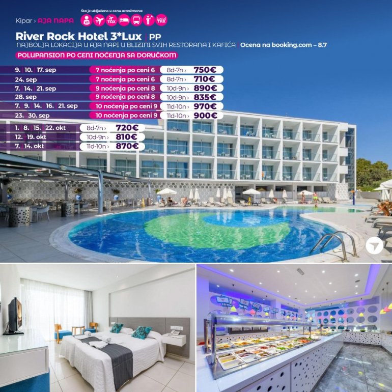 Хотел River Rock налази се у месту Аја Напа и поседује отворени базен и терасу за сунчање. На располагању је дечије игралиште, а бесплатан бежични интернет је доступан у целом објекту. Све собе нуде балкон са погледом на град. Поред тога садрже flat-screen ТВ и клима-уређај. Гостима је на располагању сопствено купатило са тушем и феном за косу. Додатне погодности укључују сеф, фрижидер и постељину. Понуда хотела River Rock укључује рецепцију која ради нон-стоп, врт и бар.