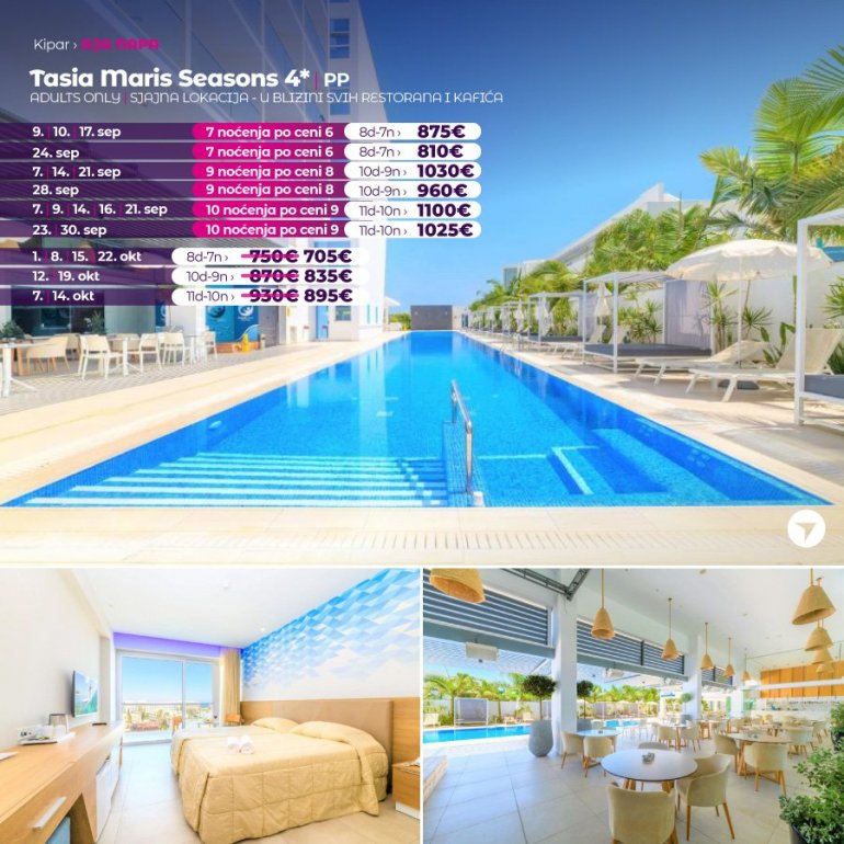 Хотел Seasons се налази у Аја Напи и нуди базен на отвореном. У овом објекту са погледом на базен могу боравити искључиво одрасле особе. Манастир Аја Напа је удаљен 400 метара. Гости могу да уживају у бару у оквиру објекта. Све собе имају flat-screen ТВ са сателитским каналима. Клима-уређај је стандардна погодност, а сеф се може добити уз доплату. Рецепција објекта ради нон-стоп. Аква-парк Waterworld у Аја Напи налази се на 5 км од хотела Seasons, а Музеј мора на 300 метара. Међународни аеродром Ларнака је удаљен 36 км од објекта.