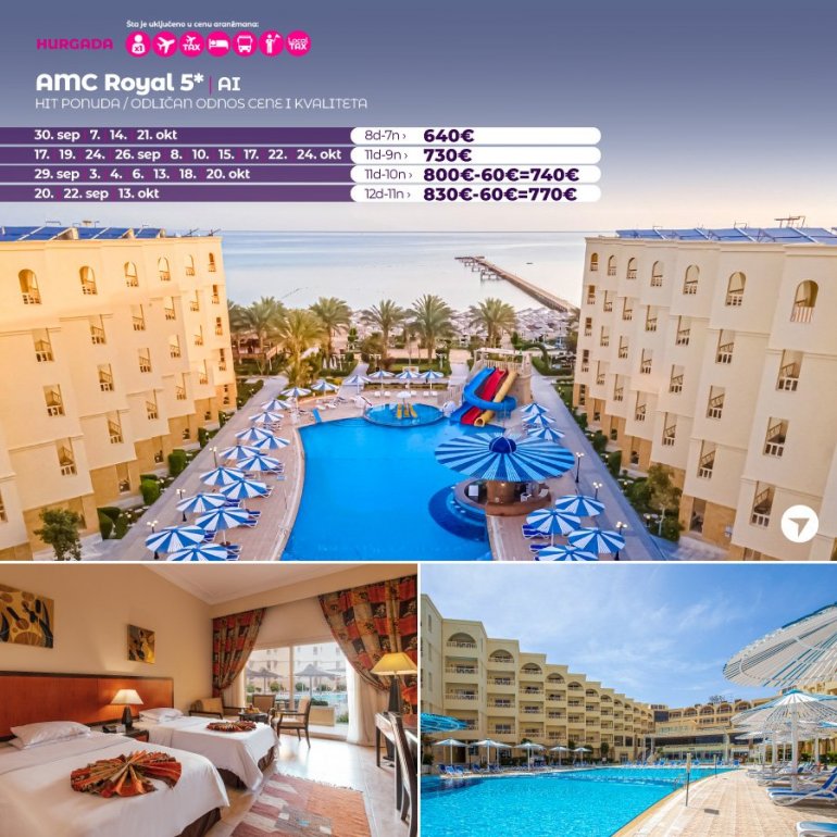 Смештен на самој плажи у Хургади, хотел АМЦ Роyал налази се у области Алахја. Поседује приватну плажу и велики избор садржаја за спортове на води, укључујући роњење и гњурање.