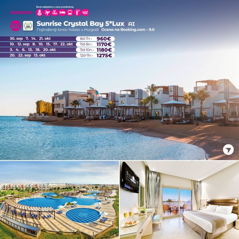 Сунрисе Црyстал Баy је луксузни ресорт са 5* који се налази директно на сопственој пешчаној плажи. Од аеродрома је удаљен око 15 километара, а од Хургаде око 20 километара ка југу.