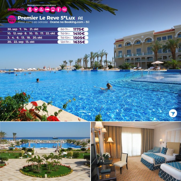Премиер Ле Реве се налази на плажи, луксузни хотел смештен у Сахл Хашиш заливу, с погледом на Црвено море. Хотел има 7 различитих ресторана, 5 барова, 4 базена, приватну плажу, одбојку на песку, аеробик, стони тенис, билијар, спа центар, сауну, услуге прања и пеглања. Ле Реве има и собе са делимичним или директним погледом на море или погледом на базен. Све собе су климатизоване и имају САТ ТВ, телефон, интернет приступ, минибар, апарат за кафу или чај, и терасу или балкон.