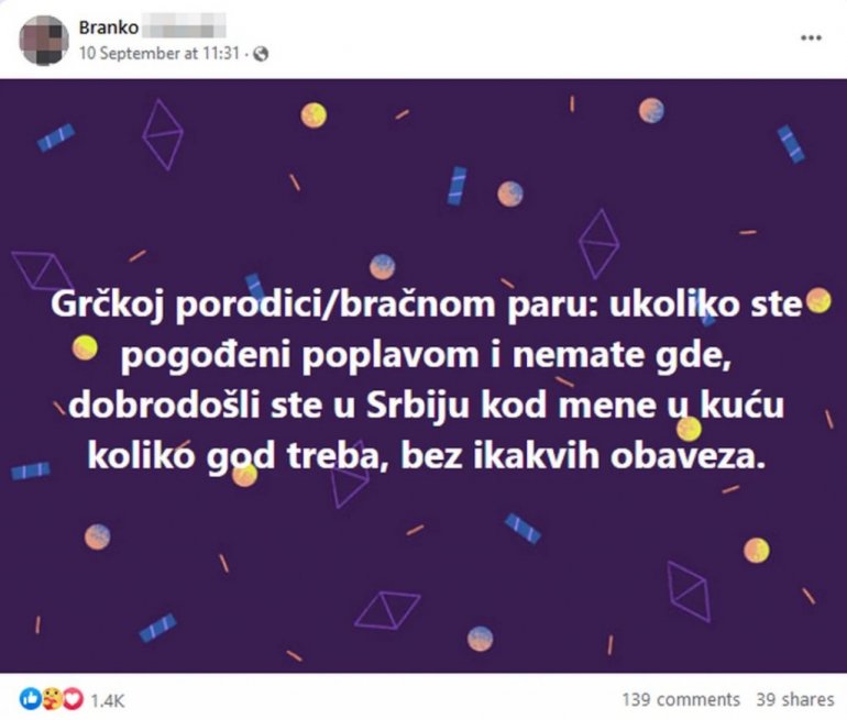 "Грчкој породици/брачном пару: Уколико сте погођени поплавом и немате где, добродошли сте у Србију код мене у кућу колико год треба, без икаквих обавеза", написао је Бранко у својој објави.