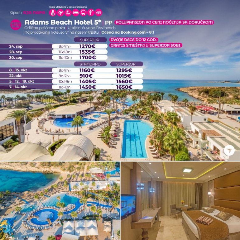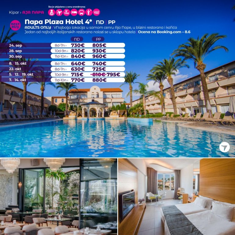 Ово је модеран и атрактиван хотел са четири звездице у срцу Аја Напе. Намењен је само одраслим гостима, а изграђен је 1989. године у близини средњовековног манастира. Овај централно лоцирани савремени и јединствени хотел који је саграђен у стилу трга нуди гостима приватност, префињеност и персонализовану услугу, што се и очекује од вишеструко награђиваног софистицираног окружења прилагођеног одраслима. Хотел је удаљен 7 минута хода од најближе градске плаже, километар од популарне Грециан баy плаже, 3 км од Нисси плаже и 4,5 км до Wатерwорлд воденог парка. Објекат се налази у самом центру Аја Напе, окружен продавницама, кафићима и ресторанима. Аутобуска станица и стари Манастир су у непосредној близини, а недалеко су и музеј Тхаласса, подводни музеј Мусан, парк скулптура и кактуса. Foto: Promo