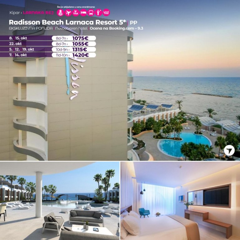 Хотел се налази у Ларнаки, на песковитој плажи која је поносни власник плаве заставице за квалитет. Од Марине у Ларнаки удаљен је око 6км, док је од центра Ларнаке удаљен 7км. У питању је новоотворен хотел са 202 елегантно и модерно уређене собе, а цео комплекс одише луксузом. У склопу хотела налази се базен, ресторан и барови. Препоручује се за све типове гостију.