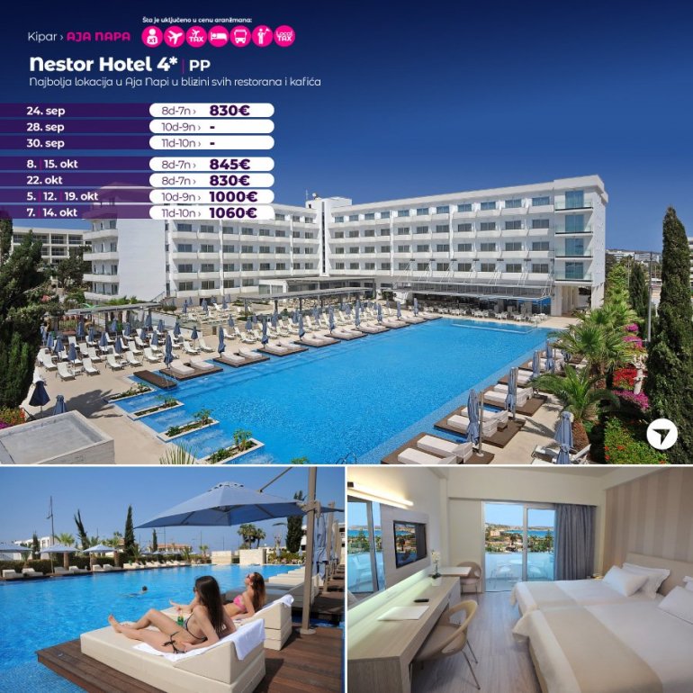 Модеран и у потпуности реновиран хотел Нестор, одлично је позициониран на само неколико минута шетње до прелепе пешчане плаже, марине и центра Аја Напе. Високо је оцењен на туристичким потралима и добитник је престижне плакете за висок квалитет услуге. Хотел од садржаја има: велики спољашњи базен са масажерима, унутрашњи базен, теретану, сауну, парно купатило, стони тенис, тениски терен, билијар, фризерски салон, дневну и вечерњу анимацију за одрасле, садржаје за децу – базен, авантура парк, ране оброке, анимацију, мини клуб. Собе су модерно опремљене, климатизоване, имају радио, фен, телефон, САТ ЛЦД ТВ, фрижидер, сеф, апарат за чај и кафу, wи-фи интернет (доступан и бесплатан у целом хотелу).