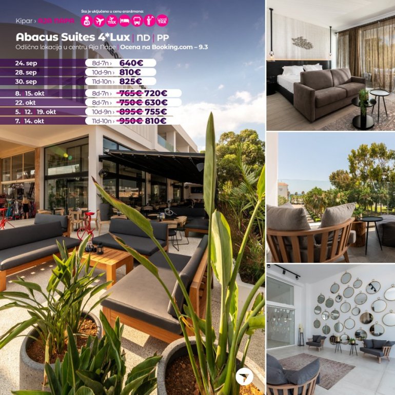 Абацус Суитес је потпуно нов хотел, са највишим оценама на туристичким порталима. Изузетно је лоциран, на неколико минута хода од центра Аја Напе и плаже. У непосредној близини хотела налазе се ресторани, кафићи, барови, продавнице и станица градског превоза. Идеалан је избор како за парове, тако и за породице, због пространих соба и услуге која може бити полупансион или алл инцлусиве.