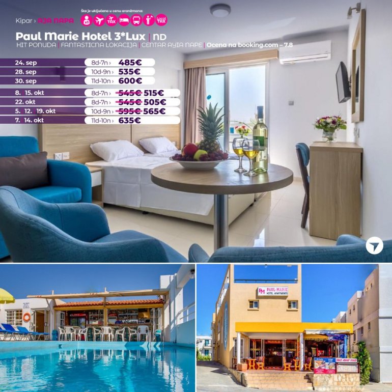 Објекат Паул Марие Хотел Апартментс је смештен у центру летовалишта Аја Напа и располаже рестораном и кровним базеном на отвореном. WиФи је доступан у заједничким просторијама. Студији и апартмани у објекту Паул Марие Хотел садрже простор за седење и балкон са погледом на врт. Осим тога, имају чајну кухињу са плочама за кување и посуђем. Купатила у смештајним јединицама су опремљена феном за косу и тушем. Објекат Паул Марие Хотел Апартментс такође нуди снек бар и рецепцију која ради нон-стоп. Међународни аеродром Ларнака је удаљен око 60 км. Понуда објекта обухвата и бесплатан паркинг.