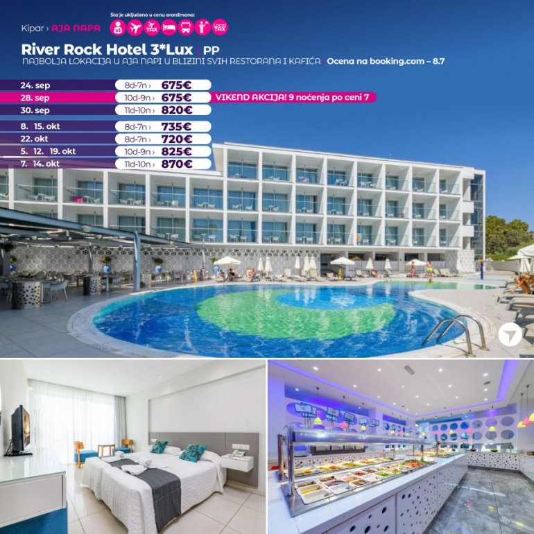 Хоте Ривер Роцк налази се у месту Аја Напа и поседује отворени базен и терасу за сунчање. На располагању је дечије игралиште, а бесплатан бежични интернет је доступан у целом објекту. Све собе нуде балкон са погледом на град. Поред тога садрже флат-сцреен ТВ и клима-уређај. Гостима је на располагању сопствено купатило са тушем и феном за косу. Додатне погодности укључују сеф, фрижидер и постељину. Понуда хотела Ривер Роцк укључује рецепцију која ради нон-стоп, врт и бар.