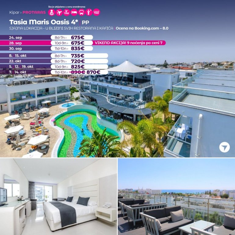 Смештен на падини, на само 5 минута хода од центра Аја Напе, објекат Тасиа Марис Оасис нуди модерно уређене смештајне јединице са бесплатним бежичним интернетом и сопственим балконом. Укључује базен слободног облика, 2 ресторана и 2 бара. Грчка плажа, највећа пешчана плажа у Аја Напи, удаљена је само 10 минута хода. На пешачкој удаљености налазе се ресторани, барови и продавнице. Паркинг у оквиру објекта може се бесплатно користити.