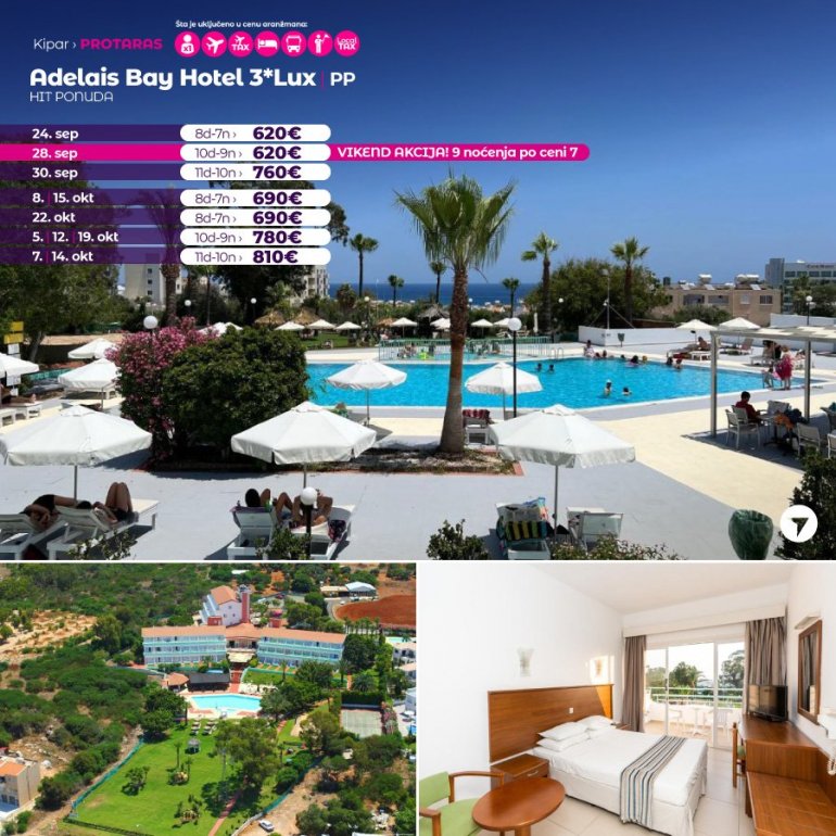 Хотел Аделаис Баy удаљен је 500м од плаже Греен баy, плажа која се налази између чувене Фиг Трее плаже и Коннос плаже. Хотелски простор покрива велика башта са отвореним базеном. Собе су климатизоване са САТ ТВ и балконом или терасом. Свака соба поседује сопствено купатило са феном за косу. У саставу хотела је Аурора ресторан и бар Илиос поред базена. Опремљен је са игралиштем на отвореном са столицама за љуљање и играоницом, док се уз доплату може обезбедити услуга чувања деце. Град Протарас удаљен је од хотела 15 минута хода.