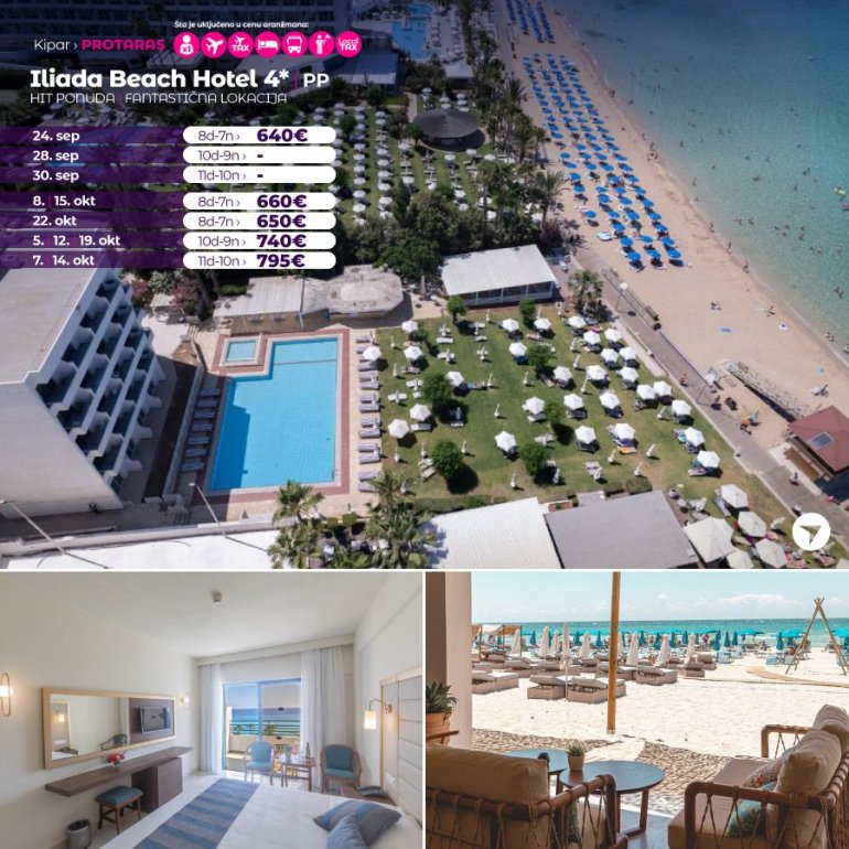 Хотел Илиада Беацх је смештен одмах поред пешчане плаже у центру Протараса и нуди базен са терасом која гледа на море. На располагању су вам такође дечји базен, два ресторана, три бара и снек бар. Све собе у хотелу Илиада Беацх имају намештен балкон, ТВ са сателитским каналима, мини-фрижидер, апарат за припрему чаја/кафе и сеф.На плажи испред самог хотела можете уживати у великом избору садржаја за спортове на води, док се ресторани, продавнице и барови налазе на неколико минута хода. Најближи аеродром је Аеродром Ларнака, удаљен 42 км од хотела Илиада Беацх.