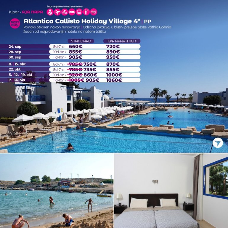 Цаллисто је комплекс осмишљен као копија традиционалног медитеранског села са белим двоспратним вилама плавих шалона, прозора и врата. Виле су окружене егзотичним дрвећем и цвећем, повезане узаним стазама са централним делом хотела, у коме се налази ресторан, рецепција, безени и пролаз до прелепе пешчане плаже. Идеалан избор за породице са децом и све остале који уживају у раскошној природи, а на неколико минута хода од главне улице познатог летовалишта Аја Напа. Центар града удаљен је 1,5км. Бесплатан улаз у аква парк недалеко од хотела!