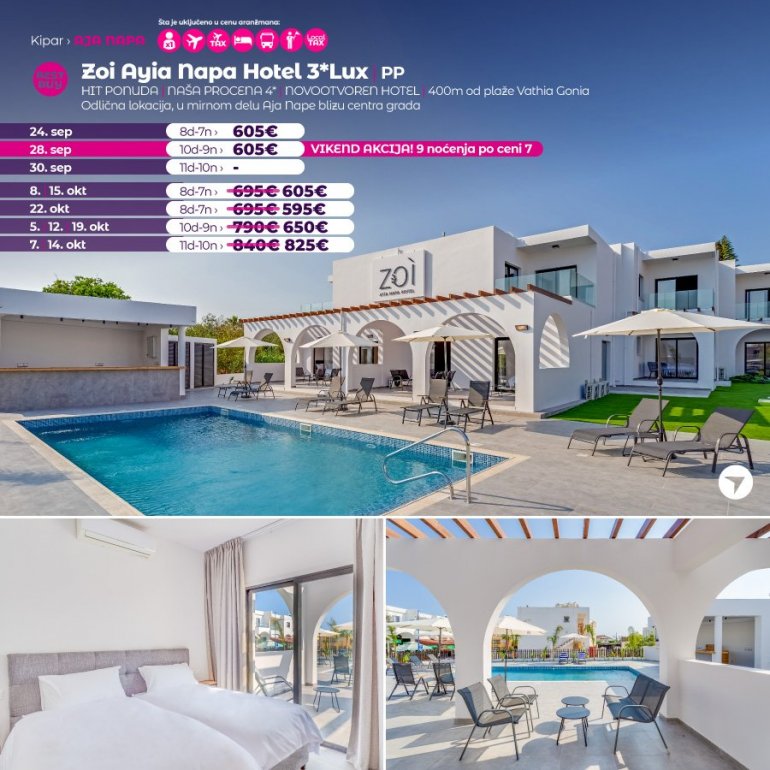 Представљамо вам хотел који средином јуна отвара своја врата за госте. У питању је потпуно нов хотел на одлицној локацији. Налази се у Аја Напи, на 15 минута сетње од центра овог места и у близини плазе Ватхиа Гониа. У близини хотела налази се бројни ресторани, барови и станица градског превоза. Хотел поседује WиФи, бар код рецепције, спољасњи базен и теретану. Собе су модерно опремљене, са АЦ уређајем