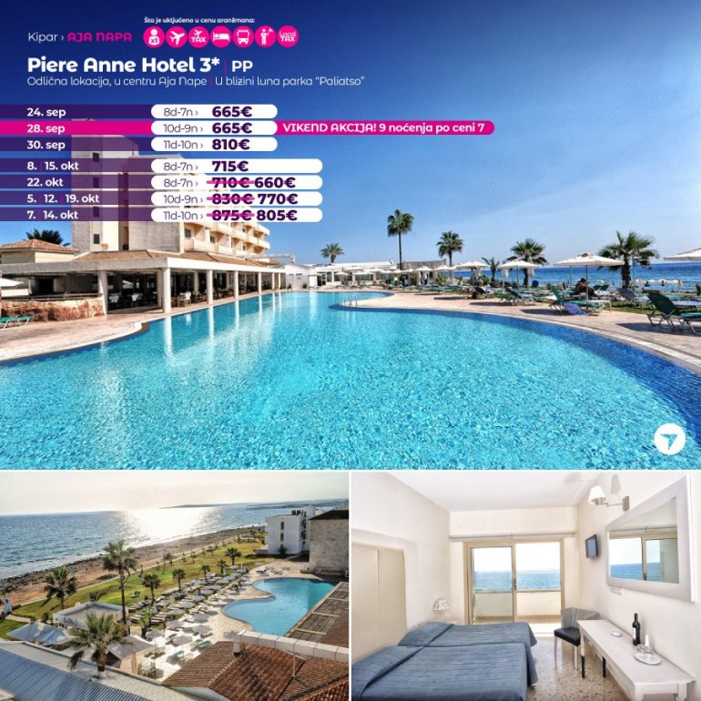 Хотел Пиере Анне има одличну локацију на обали мора, на 5 минута од центра Аја Напе и на 5 минута од луке и плаже. Забавни парк Парко Палиатсо Фун се такође налази одмах иза хотела, заједно са чувеном улицом Нисси Авенуе. У непосредној близини налазе се продавнице, барови и ресторани, а сви садржаји Аја Напе су на дохват руке. Хотел Пиере Анне се састоји од 3 блока соба са 2 велика отворена базена.Базени имају директан приступ стази уз море, а бар поред базена "Ен Пло" је одлично место за опуштање током дана. Иако хотел нема много садржаја на лицу места, Пиере Анне је толико близу свега у Аја Напи да је одлична база за забаву на плажи или провод у клубовима, као и одмор уз Медитеран.