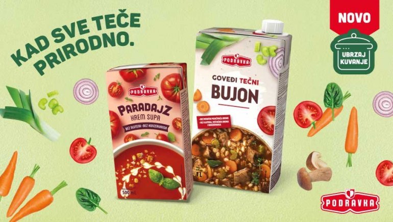 У данашњем ужурбаном животном темпу проналажење времена за припрему брзих и нутритивно уравнотежених оброка често представља изазов. Управо зато, Подравка је развила нову линију готових крем супа и текућих бујона, уз које припрема квалитетних, природних и укусних оброка никада није била једноставнија. Чак и они који се не сналазе у кухињи, у само неколико минута могу уживати у фантастичној крем супи или припремити богато јело уз помоћ готовог бујона. Производи не садрже додане појачиваче арома, глутена, вештачке ароме, боје и конзерванса.