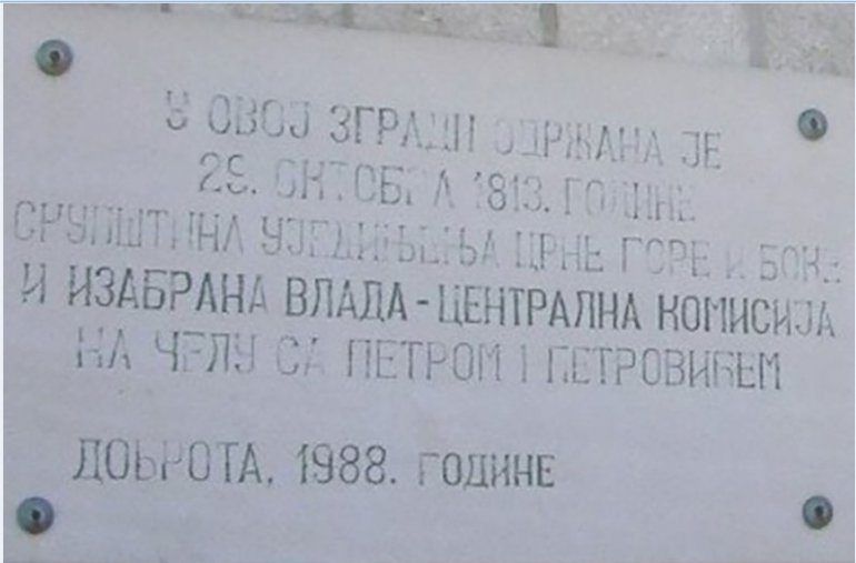 Зграда у Доброти у којој је одржана Скупштина уједињења Боке и Црне Горе 1813. године, Фото Архив Котор, Архив Херецег Нови, Музеји Котора и Херцег Новог, Профимедија , Портал Атлантик , Синиша Луковић, Документација „Новости“ и „Борбе“, "Википедија" и Фејсбук...