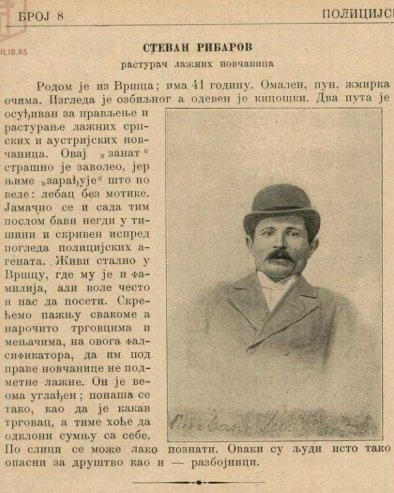 -Изгледа је озбиљног, а одевен кицошки. Два пута је осуђиван за прављење и растурање лажних српских и аустријских новчаница. Овај „занат“ страшно је заволео, јер њиме „зарађује“ што оно веле: „лебац без мотике“ – записано је у „Полицијском гласнику“.