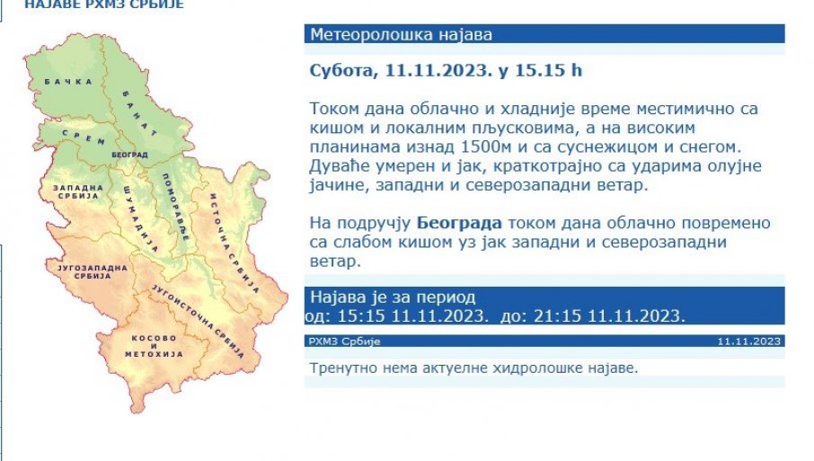 - Током дана облачно и хладније време местимично са кишом и локалним пљусковима, а на високим планинама изнад 1.500 метара и са суснежицом и снегом. Дуваће умерен и јак, краткотрајно са ударима олујне јачине, западни и северозападни ветар - наводи се у најави РХМЗ-а.
