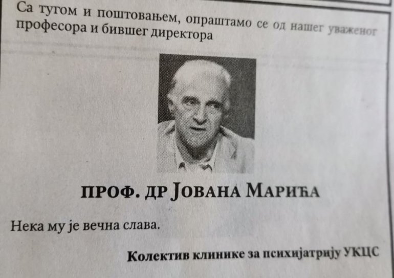 ПРЕМИНУО ПСИХИЈАТАР ЈОВАН МАРИЋ: У читуљи се опраштају од чувеног професора (ФОТО)