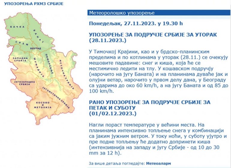 - Умерено до потпуно облачно у првом делу ноћи тек понегде са слабим падавинама, а другом делу ноћи и сутра (28.11.) јаче наоблачење са кишом. Дуваће јак јужни и југозападни ветар, нарочито на планинама, а у кошавском подручју јак југоисточни ветар са ударима олујне јачине на југу Баната (од 85 до 100 км/х) - наводи се у РХМЗ најави.