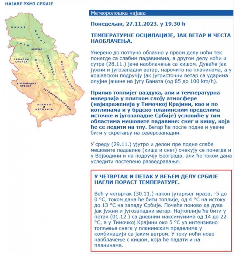 Већ у четвртак (30.11.) након јутарњег мраза, -5 до 0 °С, током дана ће бити топлије, од 4 °С на истоку до 13 °С на западу Србије. Почеће поново да дува јак јужни и југозападни ветар. Најтоплије ће бити у петак (01.12.) са дневним максимумима од 14 до 22 °С, а у Тимочкој Крајини око 5 °С уз интензивно топљење снега у планинским пределима у комбинацији са јаким ветром. У току ноћи ново наоблачење с кишом, која ће падати и на планинама.