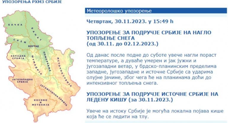 Због тога ће на планинама доћи до интензивног топљења снега, тоји у најновијем упозорењу РХМЗ од 15:49 часова.
