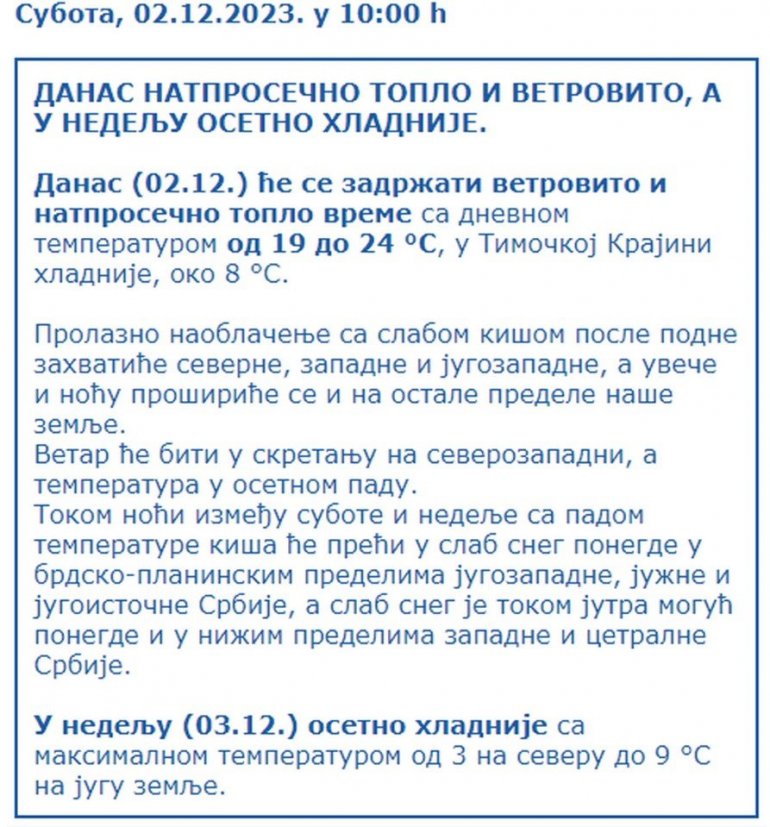 Током ноћи између суботе и недеље са падом температуре, киша ће прећи у слаб снег понегде у брдско-планинским пределима југозападне, јужне и југоисточне Србије. Слаб снег је током јутра могућ понегде и у нижим пределима западне и цетралне Србије.