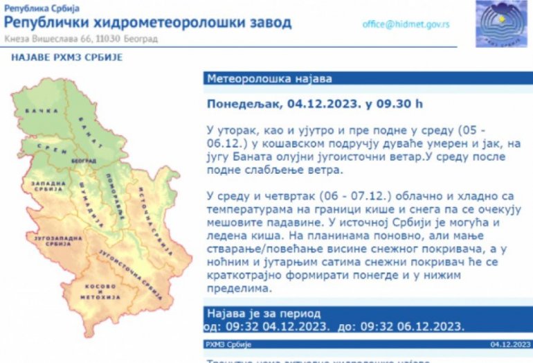 - У уторак, као и ујутро и пре подне у среду (05 - 06.12.) у кошавском подручју дуваће умерен и јак, на југу Баната олујни југоисточни ветар. У среду после подне слабљење ветра. У среду и четвртак (06 - 07.12.) облачно и хладно са температурама на граници кише и снега па се очекују мешовите падавине. У источној Србији је могућа и ледена киша. На планинама поновно, али мање стварање/повећање висине снежног покривача, а у ноћним и јутарњим сатима снежни покривач ће се краткотрајно формирати понегде и у нижим пределима - стоји у најави РХМЗ-а, преноси Информер.
