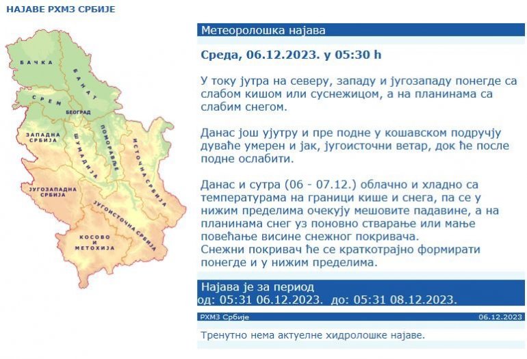 Данас и сутра (6‒7. децембра) облачно и хладно са температурама на граници кише и снега, па се у нижим пределима очекују мешовите падавине, а на планинама снег уз поновно стварање или мање повећање висине снежног покривача.