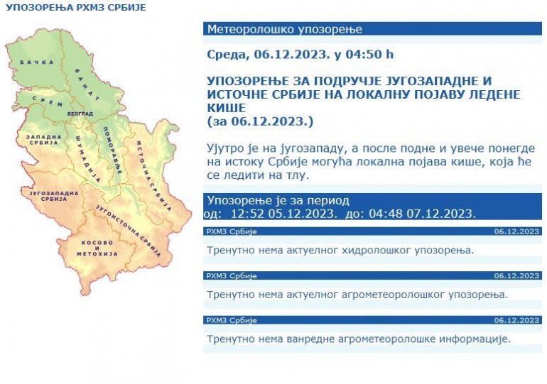 РЕПУБЛИЧКИ хидрометеоролошки завод (РХМЗ) издао је упозорење на појаву ледене кише.