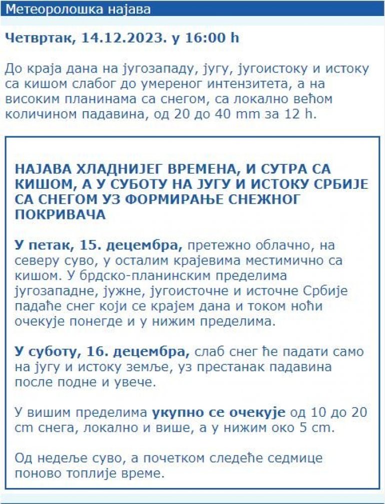 - У петак, 15. децембра, претежно облачно, на северу суво, у осталим крајевима местимично са кишом. У брдско-планинским пределима југозападне, јужне, југоисточне и источне Србије падаће снег који се крајем дана и током ноћи очекује понегде и у нижим пределима.