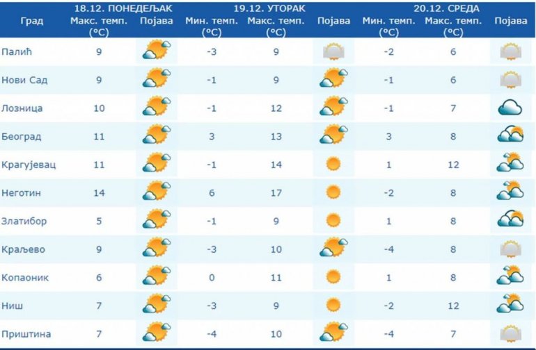 Најхладније ће у уторак за Никољдан бити у Краљеву са -3 степена ујутру, а најтоплије у Неготину са чак +17 степени преко дана. У Београду ће минимална дневна бити 3, а максимална 13, у Крагујевцу минимална -1, а максимална 14.