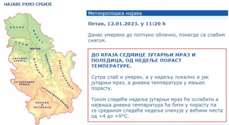 - Сутра слаб и умерен, а у недељу локално и јак јутарњи мраз, а дневна температура у мањем порасту. Током следеће недеље јутарњи мраз ће ослабити, а највиша дневна температура ће бити у порасту, па се средином следеће недеље очекује у већини места од +4 до +9 степени Целзијуса - наводи се у најави РХМЗ-а.