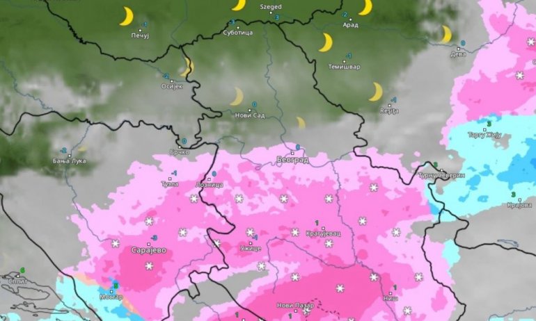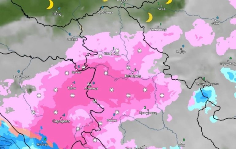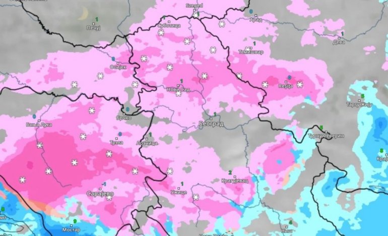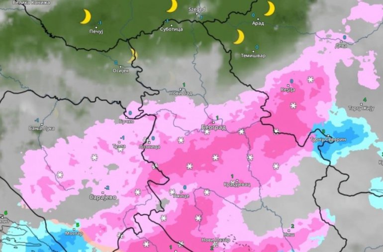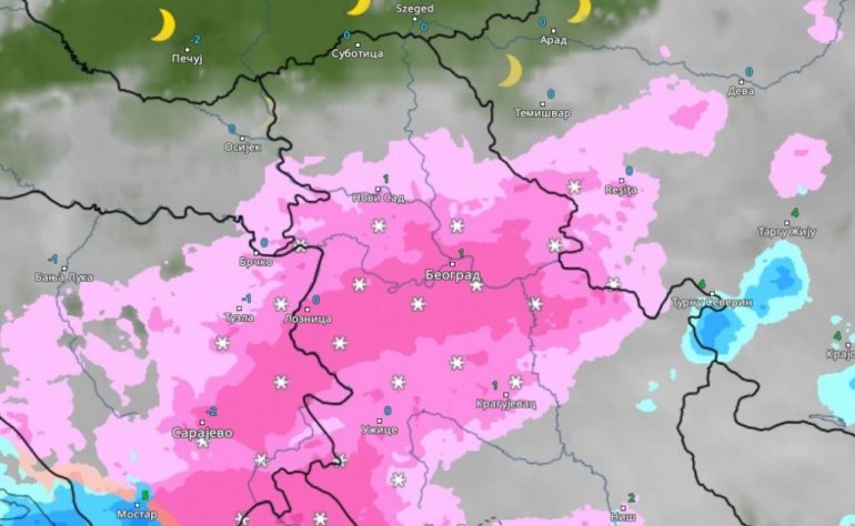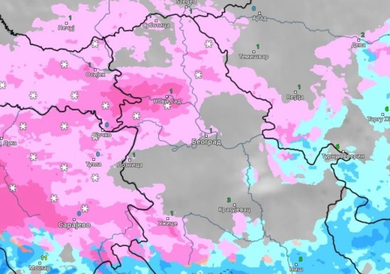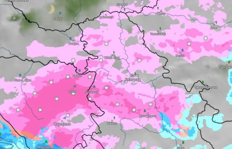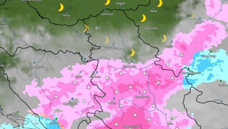 Како се може видети на метеоролошкој мапи на сајту времерадар.рс, снег ће падати пре подне у Војводини, средином дана у западној Србији, после подне у централним и југозападним крајевима, а крајем дана и у току ноћи и у осталим пределима, али уз истовремени престанак падавина на северу.