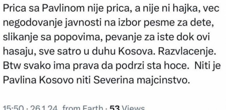 - Прича са Павлином није прича, а није ни хајка, већ негодовање јавности на избор песме за дете, сликање са поповима, певање за исте док ови хасају, све шатро у духу Косова. Развлачење. БТW свако има права да подржи шта хоће. Нити је Павлина Косово нити Северина мајчинство.