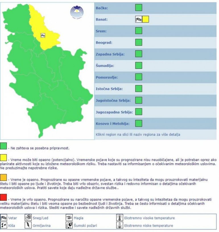 У Банату је данас због јаког ветра на снази жути метео аларм, што значи да време може бити потенцијално опасно: Временске појаве које су прогнозиране нису неуобичајене, али је потребан опрез ако планирате активности које су изложене метеоролошком ризику. Треба наставити са информисањем о очекиваним метеоролошким условима. Не предузимајте непотребне ризике.